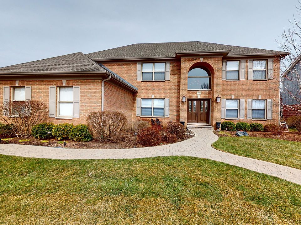 Sought after all brick contemporary home on corner lot. Expansive interior with hardwood flooring throughout. Large eat-in kitchen with oak cabinets, granite countertops and all stainless appliances. Large vaulted ceilings and a second floor which overlooks family room. Spacious master bedroom with his and hers walk-in closets and large master bath featuring whirlpool tub and separate shower. All bedrooms feature walk-in closets. Full finished basement with a secondary kitchen, full bath, and ample storage. Brick paved walkways and patio along with a cozy fire-pit and sprinkler system. Roof approximately 5 years new. Walking distance to Greenbrier Elementary. Please exclude theatre room and media.