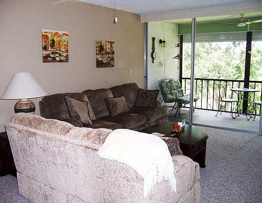 This is a lovely 2 bedroom, 2 bath room updated and fully furnished condo with spectacular golf course views. You will love sitting on your balcony, which is screen enclosed and has electric storm shutters, watching the action and enjoying the beautiful landscaping. This spacious third floor unit has many amenities including, updated tile in both bath rooms, new roof (2009), new carpet and appliances. Fresh paint is throughout the unit as well. The large master bedroom includes a walk in closet and separate dressing area. You have a reserved covered carport & there is plenty of guest parking. Numerous social activities are available to participate in. Just a short distance to shopping, minutes to the beach & located in a non evacuation zone. This is a 55+, no pet complex with a low $202 monthly fee.