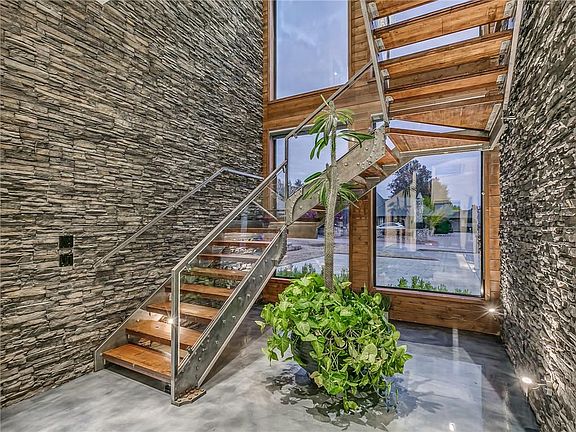 Sleek lined contemporary custom built in 2014 offers expansive windows capturing the fabulous Oklahoma sunsets A dramatic flair from the stunning exterior to the soaring ceilings and open floor plan. Rich wood accents, stacked stone walls and a one of a kind staircase that is simply a work of art. Master suite has access to the pool and outdoor living along with an incredible bath and huge walk in closet The downstairs secondary bed is nice size, ensuite and has a great walk in closet. Upstairs offers the third bed and bath, large game room, plus media area that is an ideal flex space for exercise room or 4th bed. Unique and special features like a glass bottom floor overlooking the entry, historical repurposed wood for the staircase, designer lighting and custom cabinetry, balconies that overlook the pool and lakeview set this home apart from any other. Love and attention was given to this special home and ready to be enjoyed by the next lucky family.