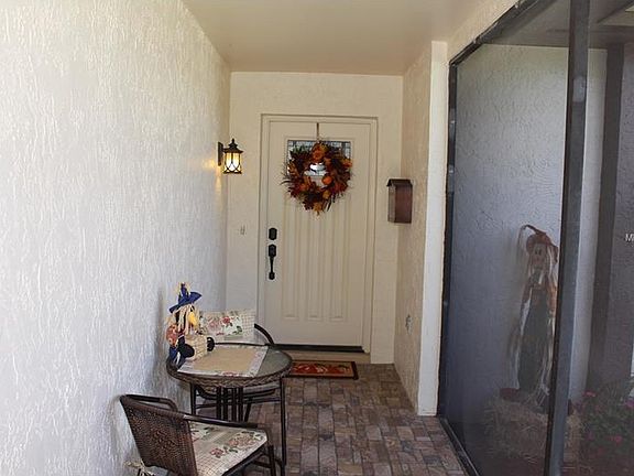 This light bright spotless clean 3/2/2 1,306 sq. ft. home is in move-in condition has beautiful curb appeal, screened mud room entry, bamboo flooring throughout, cathedral ceiling - 8' ceilings. Spacious eat-in kitchen with wood cabinets and plantation shutters as well as updated appliances. Great room with wood-burning fireplace. Split bedroom floor plan, 2nd bathroom has been updated. Large lanai - perfect for morning coffee. Roof is new. A/C is new, freshly painted exterior. Close to all shopping. schools and area beaches. Low HOA covers clubhouse with all it's amenities including heated pool 7 days a week. 45 minutes to TIA. This is a must see home. You will not be disappointed.