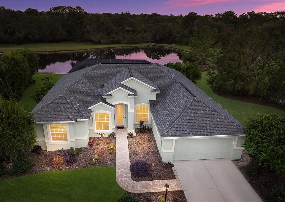 Located In Summerfield in the Heart of Lakewood Ranch , this Custom built Lee Wetherington Home with saltwater pool is set on one of the most Beautiful, Private Waterfront sites with a 180 degree view of Florida’s Natural Beauty. This Home could be the One You are Searching for! As you enter the home enjoy these stunning views thru the sliders in the Living room which is adjacent to the Dining room and Den. The open split floor plan integrates the indoor and outdoor space with multiple sliders and large Aquarium window and newer hurricane impact windows. The Large kitchen opens to the Family room featuring tray ceiling, crown moldings and sliders to the Lanai. Kitchen features include solid wood cabinetry, stainless appliances, Cambria quartz countertops , peninsula island and walk-in pantry. Enjoy Nature’s views with your morning coffee in the café area with aquarium window. Relax in the Main Bedroom with Sliders to the Lanai featuring 2 large walk in closets and a large Bath with Garden tub, separate Shower and dual Vanities. With a Split floor plan the 2 add’l Bedrooms enjoy privacy sharing a Bath behind pocketing doors on the opposite side of the home. Other updates Include: New Roof 2019, Fresh Interior paint, Lanai deck resurfaced , Pool cage repainted and rescreened, New irrigation system, New sod on entire lot and Garage floor epoxy finish! See complete list online. Enjoy the Florida lifestyle in this Best Selling Multigenerational Community with A-rated Schools. The Home is walking or Biking distance to Heron’s nest Preserve, nature trails, parks, playgrounds, sports fields and tennis courts, Conveniently located near Lakewood Ranch Main Street with excellent restaurants, shopping, cinema and close to public and private golf courses. A short drive to award winning Gulf Coast Beaches. Make this Home Yours! Hot Tub on Lanai is included.