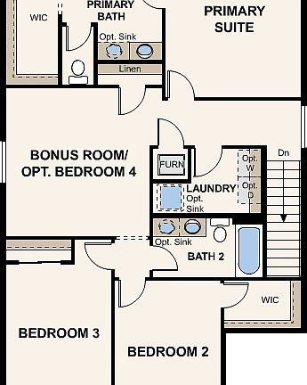 The main floor of the lovely Lina plan is anchored by an open-concept dining and great room area--flanking a well-appointed kitchen with a center island and ample pantry space. A versatile bonus room can be found upstairs--also available as an extra bedroom--plus two secondary bedrooms and a large primary suite, boasting a walk-in closet and an attached bath with a walk-in shower. Additional options include a covered patio and a great room fireplace.