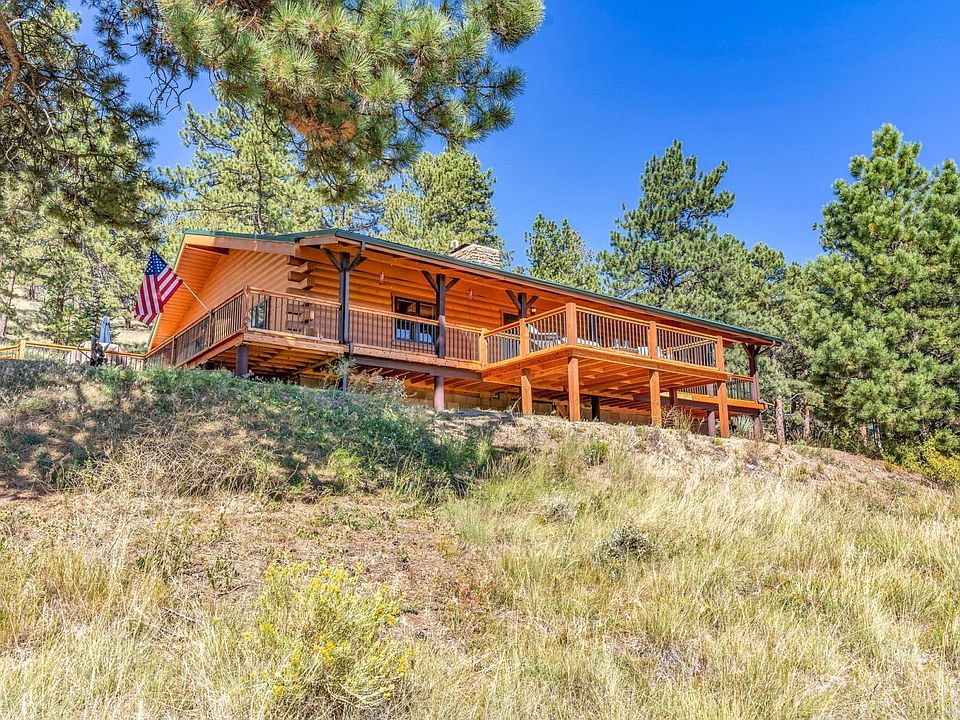 Log Cabin on 41 wooded acres in Westcliffe, Colorado. Beautiful mountain home with 41 acres of pristine pines nestled in the Wet Mountain range with serene views and abundant wildlife. This single-level 3 bedroom, 2 bath vaulted ceiling home is complete with a gourmet kitchen, bath, and flooring newly renovated in 2022. An expansive wrap around deck updated in 2022 provides multiple seating areas with unobstructed views of rolling hills and meadows. Beautiful tongue and groove pine with wood beams and a stone fireplace with high efficiency circulation blowers provide a cozy, cabin feel. The fully remodeled, gourmet kitchen includes custom cabinetry, spacious granite counter tops, and premium stainless-steel GE Caf smart appliances including a 5-burner gas cook top with lighted downdraft, French-door oven, dishwasher, and refrigerator. The remodeled bathroom includes a tile rain shower, new vanity & granite countertop, and new high efficiency LG ThinQ washer and dryer. The large primary bedroom with ensuite bathroom has vaulted ceilings and two generous closets. A spacious, deep 4-bay garage with 9-foot doors and two workshops is perfect for storing your ATV/UTV and other vehicles. No HOA and only 10 minutes from Westcliffe.
