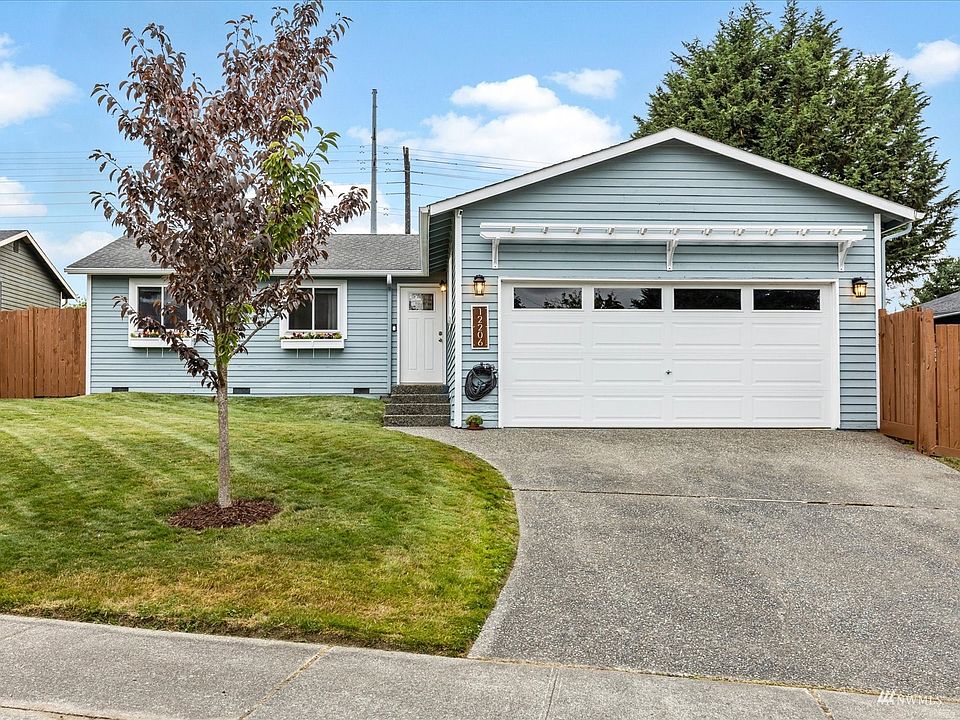 Charming 3 bed, 2 bath home now available! Sitting on one-level with ~1150 sqft, this home features brand new flooring, bright open concept living + spacious dining overlooking large back yard. The kitchen offers open shelving with pantry storage, bar seating and easy entertaining with French doors to back patio. Down the hall you'll find a full bath and three bedrooms, including great-sized primary bedroom with full en suite. New engineered hardwood floors and paint throughout most of the home. All appliances stay. Outside is complete with fully fenced back yard, custom firepit, driveway parking, and attached two-car garage with laundry.