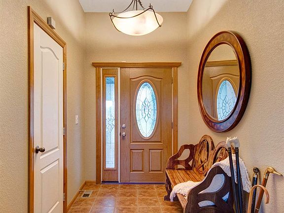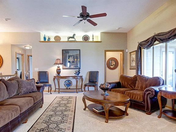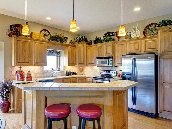 Vacation every day! The view from the covered deck and every tinted rear window is a panoramic of water, trees and Kansas sunsets! Sip morning coffee on the wrap around front porch with lovely landscaping. Five bedrooms and three baths affords a multi-generational family all of the privacy and space desired. The main floor boasts an open floor plan with living room and see-thru fireplace to hearth room. The kitchen with beautiful maple cabinetry and floors as well as maple trim throughout including downstairs, shows off all of built-in quality. The master suite has entrance to the lovely deck and view of the water. The suite also includes whirlpool, vanity sinks, and walk-in closet. The downstairs retreat is to die for! Wet bar, large family room with surround sound and additional rooms with many built-ins for use as you wish. Keep your family safe during storms in the under porch safe room. The walk-out walk-up is complete with a worry free sump-pump! Too many extras to mention in the beautifully maintained home.
