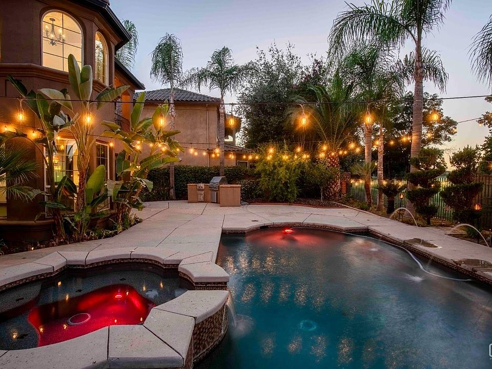 Amazing golf course views await in this Seven Oaks Grand Island home, perfectly situated on the third fairway of the Island course with stunning lake views and double-gated homes beyond. The backyard is an entertainer's dream with lush tropical landscaping, sparkling pool, spa, and built-in BBQ. Inside, modern tile flooring spans the ground floor, where you'll find a family room with quartz-trimmed fireplace and French doors opening to the patio, a formal dining room, and a gourmet kitchen with high-end appliances including double ovens, vent hood, custom cabinetry, quartz counters, decorative backsplash, and a sunny breakfast area. Upstairs, the relaxing primary suite boasts a private balcony overlooking the golf course, a two-sided fireplace, and a luxurious bath with elegant soaking tub framed by windows showcasing the spectacular views. This is a rare opportunity to own a prime golf course property offering beauty, comfort, and resort-style living.
