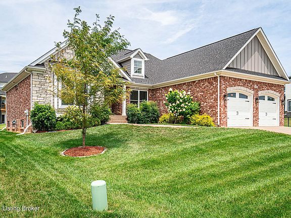 Behold this gorgeous brick & stone ranch Craftsman Home in the Woods of Landherr. This 3BR, 3 BA home is a must see that comes complete with an open and airy design with the perfect split floor plan. The eye-catching vaulted beamed ceiling in the great room features a custom stone fireplace with shiplap and well-crafted bookshelves that leads to the beautiful chef's kitchen with quartz countertop, and a functional island adjacent to DR w/ crown molding tray