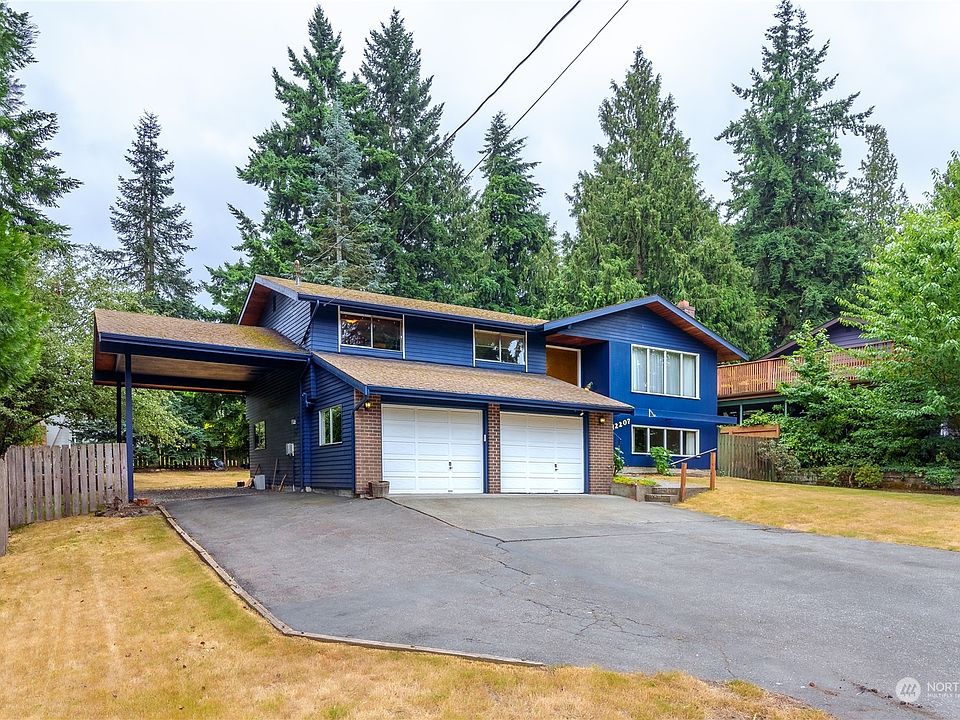 Spacious mid-century split level waiting for your touches. The main level of home features spacious living room w/fireplace, dining room eating bar in kitchen & family room w/free standing wood stove. Primary bedroom, full bath w/skylight, 2 add'l bedrooms & a 3/4 bath complete the main level. Deck opens off both family & dining rooms. Lower level includes Rec room, laundry w/3/4 bath & access to 4 car garage & carport for boat/RV parking. The Silver Lake Neighborhood has everything: Easy carpool access to I-5, large choice of dinning & shopping options. Best of all are the 3 public parks granting access to Silver Lake. Thornton Sullivan, Green Lantern & Hague Homestead Parks offer swimming, picnicking, fishing & even a cartop boat launch.