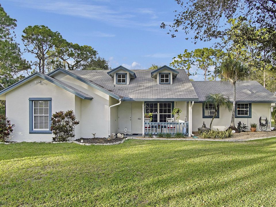 NEW ROOF WILL BE INSTALLED BY END OF FEBRUARY! Must see this move-in ready 3 BR, 2 bath CBS ranch home in The Acreage, located on a quiet street with lots of trees. This 1.3 acre fully fenced property backs up to a canal so you can enjoy added privacy, wildlife, and even fishing! Experience peace and tranquility on the spacious screened-in back porch and spend year-round enjoyment in the well-maintained above ground pool. The interior of this home is well-maintained and features an updated eat-in kitchen and updated bathrooms. The exterior has recently been painted. No HOA here to restrict parking your RV, Boat or other toys on your own lot! This treasure evokes a country feel where you can enjoy equestrian activities, yet is minutes from all conveniences, including shopping, golf courses, restaurants and is approximately 30 minutes from our beautiful beaches!