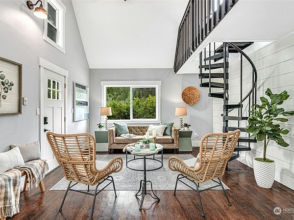 Farmhouse chic! Welcome home to this charming 2 bed, and two 3/4 baths home, on nearly 2.5 acres. Original hardwoods welcome you into a great room concept, allow the French doors to pour in sunlight and invite the outdoors in off the large entertaining size deck. Updated kitchen, butcher block counters & gas stove. Primary on the main, with a gorgeous bath attached, double vanity & walk in closet. Fun spiral stairs take you to the loft bedroom, and bonus space. Allow the imagination run wild outdoors, with space to entertain, garden, or just relax in the sun drenched yard. Updates include ductless mini-split, heat and A/C! Tankless water heater, new roof, and much more. Conveniently located to downtown Duvall. Pre-Inspected!