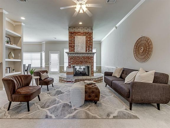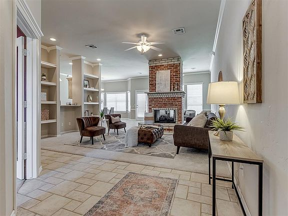 Semi-open floor plan with 4 bedrooms, 3 full baths, a study and an open flex space. Split plan with primary suite and one bedroom on one side and 2 additional bedrooms on the other. Crown moulding throughout common areas with a beautiful two-sided brick fireplace separating a sitting area from the main living room. Huge dining area adjacent to the sitting area & kitchen. The space can easily accommodate additional tables for larger gatherings. The kitchen features quartz countertops, tiled backsplash, Blanco ceramic undermount double sink, a lazy Susan in the corner cabinet and large walk in pantry in the laundry room. Off the dining/kitchen area you will find two bedrooms, a bathroom and large storage area in the hallway. Both of these are large bedrooms, one with a walk in closet. The primary suite features a box ceiling, bath with separate shower & jetted tub, vanity with two sinks and a built-in makeup counter and closet with built in shelves & lots of upper and lower rods. The 4th bedroom is also very large across from the primary bedroom on the front of the house. The study off the living room features oak paneling & glass door. 3 car garage with doors leading to the front porch & the back yard and a storm shelter. Large back yard with open patio. Great curb appeal with two tone brick/ tumbled brick, a cool spiral brick column, and low maintenance flower beds. Kimberly Place is a small addition with just 75 homes tucked in a quiet area in Northwest OKC with the convenience of lots of shopping, dining and entertainment options close by.
