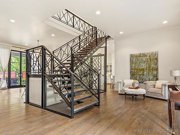 Welcome to this beautiful home in the gated community of Woodmere. This custom one-of-a-kind home, built by Rob Key with over 5,800 Square Feet (AP), features 5 spacious bedrooms, 4 Full Baths, 2 Half Baths, with a 3 Car Garage. 4 of the bedrooms have their own private bath and walk-in closets. The master suite and guest bedroom are on the main floor, along with a half bath. Upstairs, you will find 3 more bedrooms, 2 with private baths and large walk-in closets, spacious 5th bedroom that could be used as a game room/gym. Separate theater room plus an open bonus area with wet bar and half bath. Soaring Ceilings throughout with 12ft doors. It also includes a separate office off the entry. The large kitchen is the heart of the home, featuring a striking center island with marble waterfall countertop, two sinks, Sub-Zero refrigerator with a recently updated Dishwasher. The spacious laundry room has a sink with ample cabinets for storage and space for an additional refrigerator. The master bedroom is a luxurious retreat. Its bathroom includes custom his-and-hers closets, separate vanities, a soaking tub, and a walk-in shower with multiple showerheads, including a rainfall feature. The doors to the master suite are made from reclaimed cypress wood from Louisiana. High-end lighting from Visual Comfort illuminates every area of the home. Enjoy the outdoors on two large balconies in the front and back of the house. The home has elegant 12-foot iron exterior doors with a stunning Iron staircase with a built-in wine cellar. The backyard has 2 separate patios, off the Master & Living with a fireplace. Built in Sonos speakers outside and a custom 36x30 Basketball Court with turf. 8ft Full Privacy fence on a corner Lot in a cul-de-sac. A must-see home in the heart of South Bixby. Schedule your appointment today.