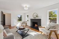 Fireplace centerpieceOpen floor planHardwood floorsBright breakfast nook