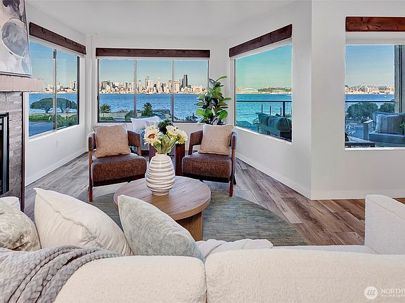 Experience iconic Seattle living with sweeping 180° views of Puget Sound, the downtown skyline, and the Space Needle. This beautifully updated condo features LVP flooring, granite counters, and stainless steel appliances. A gas fireplace with stone surround and wood mantle anchors the oversized living room, which lives large and could convert to a third bedroom. The flex-space entry is perfect for a home office or creative nook. Retreat to the spacious primary suite with ensuite bath. Enjoy year-round outdoor living on the 120 sq ft covered deck, ideal for entertaining or quiet evenings. Secure garage parking, convenient elevator, and steps to the West Seattle passenger ferry complete this special home.