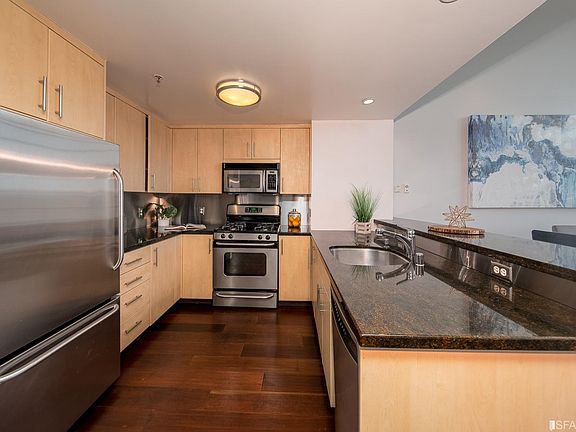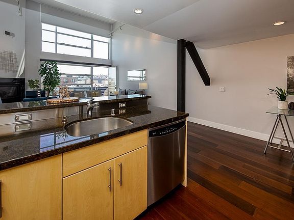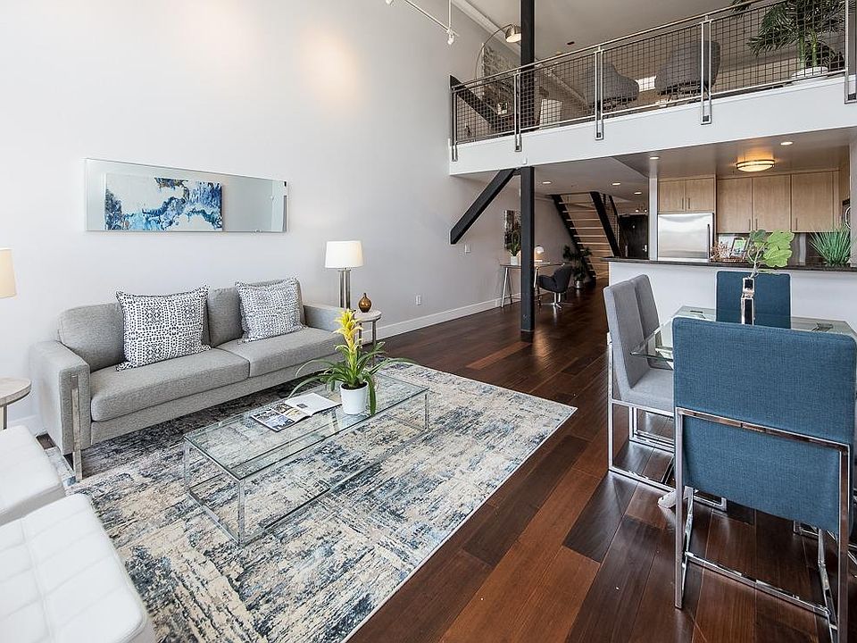 Stunning top floor bi-level 1 bedroom + office/2nd bedroom + 2 bathroom live/work loft in the heart of SOMA. Facing away from the busy streets, this quiet city oasis has grand living spaces w/ soaring ceiling heights in an expansive 1316 sqft floorplan. Main floor features an open chef's kitchen with a gas range, stainless steel appliances & dining area. A large living room w/ gas-burning fireplace, a separate den that can be used as a home office/guest room/fitness studio/2nd bd, & fully renovated bathroom w/ deep soaking tub completes the main floor. Custom metal railing leads up to a spacious master bedroom suite w/ a skylight, custom built walk-in closet, a combo W/D, & luxurious renovated bathroom w/ double vanity. Enormous deeded onsite storage, 1 car deeded parking space, elevator, professional management & low HOA dues with excellent reserves. Easy access to CalTrain, Bart, 280/101. Enjoy amazing restaurants, Trader Joes, Costco, Embarcadero Waterfront & Union Square nearby