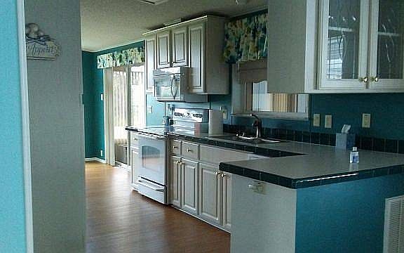 2001 Homes of Merit with over 1240 sq feet plus 12 x 14 enclosed Sun Room with air conditioner on back side of home. This includes sliding doors to the kitchen. This split plan 3 bedroom or 2 bedroom and den with vaulted ceilings is unfurnished. Eyebrow windows in living room, kitchen and guest rooms. There are insulated windows and newer laminate wood flooring throughout. Galley style kitchen with counter space galore, a walk in pantry and newer appliances. This home features master bedroom with his and hers walk in closets while the master bath has his and hers sinks, glassed in shower and linen storage. The home features an interior laundry. A golf cart is included and features new batteries.