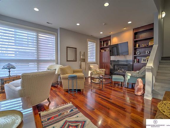 Downtown living at its finest! North facing "C" corner unit has 2BD + den, 3BA w/roof top deck & 2 car attached garage. Spectacular downtown views. Wood floors. Kitchen w/granite & SS appliances are included w/eat-in area. Living room has corner windows to enjoy views w/fireplace & built-in cabinets. Bedrooms w/walk-in closets & full baths. 2 decks. Roof top deck is perfect for entertaining. Wonderful small-town community feel just a block away from the Old Market.
