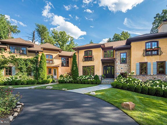 Nestled on over 1.5 acres of picturesque landscape, this custom-built Tuscan estate home showcases modern upgrades and luxurious features throughout. Accessed via a tree-lined driveway, the property exudes elegance and charm from the moment you arrive. Step inside to discover beautifully appointed interiors flooded with natural light, boasting grandly proportioned rooms and a highly desirable layout. Recent upgrades have elevated both the allure and functionality of the home, including the installation of new quartz countertops and backsplashes in the gourmet kitchen. Enhanced with Kountry Kraft cabinetry and updated hardware, the kitchen also features a refreshed island, perfect for casual dining or gathering. Throughout the residence, you'll find exquisite hardwood floors, exposed beams, oversized windows, and upgraded light fixtures that create a warm and inviting atmosphere. The main level offers a spacious family room with a stunning stone fireplace, ideal for casual enjoyment, while the adjacent dining room, complete with a wet bar, is perfect for hosting guests. Multiple decks, including a covered veranda and expansive lounge area with an outdoor fireplace, provide ample opportunities to enjoy the serene surroundings and entertain guests. Upstairs, the luxurious primary suite is a private retreat, featuring hardwood flooring, a gas fireplace, Juliet balcony, and his/her walk-in closets. The ensuite bathroom includes heated floors, and has been tastefully updated with new fixtures, adding to the home's modern appeal. Three additional bedrooms, each with its own ensuite bathroom, provide plenty of space and comfort for family and guests. One of them features a Juliet balcony and has a newer vanity with quartz countertops in its en-suite bathroom. At the end of the hallway, a versatile apartment-style suite offers endless possibilities. Featuring a bedroom, bathroom, home office, and den with fireplace, this space is perfect for multi-generational living or accommodating guests. The fully equipped kitchen and bonus room with built-in shelves provide added convenience and functionality. The finished lower level, designed for relaxation and recreation, is above ground and receives abundant natural light. Here, you'll find a spacious family room, perfect for gatherings and movie nights, alongside a game room and exercise area. A powder room adds convenience to the space, while a dedicated craft area with a sink provides a creative outlet for hobbies. The walk-out feature seamlessly blends indoor and outdoor living. Abundant storage is available. Additionally, two staircases allow convenient access to the lower level, enhancing its flow and accessibility. This fully geothermal home produces efficient heating and cooling. A tankless water heating system, heated floors in the kitchen, mudroom area, and guest-suite bathroom offer enhanced comfort and energy efficiency. A whole-home backup generator provides peace of mind, and synthetic exterior materials allow for minimal future maintenance. The storm water system is another bonus, as heavy rainwater drains into underground pits, preventing surface water flooding. There's a two-car garage with a 200 amp Tesla charging station, as well as an extra one-car garage, both giving inside access to the home. The grounds create a serene retreat, with ample space for outdoor activities and entertaining. Stone steps guide the way to a tranquil brook, accompanied by expansive newly landscaped grounds, offering a serene retreat. Furthermore, more than 25 trees were planted along a property line to enhance privacy. Ideally located in walking distance to the Village of Gladwyne, with scenic Bridlewild hiking trails steps from your door and the 87-acre Kenealy Nature Park close by, this home truly has it all - this home truly has it all - combining luxurious living with modern amenities in a idyllic setting.