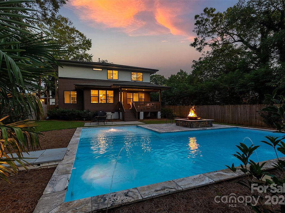 Summer may be coming to an end, but your backyard enjoyment is just getting started. Resort living awaits in this like-new contemporary with heated saltwater pool with LED lighted fountains, and a water/fire feature you have to see to believe. There's a patio for outdoor dining, plus a deep covered back porch overlooking the privacy-fenced yard. Inside, an open layout connects the living room with fireplace, to the kitchen with soft close cabinetry, spacious island, a beverage cooler, and large pantry. The light-filled dining room leads to a flex space, currently a gym, but also a great home office. There's a bedroom and full bath on the main floor. Upstairs, you'll find 4 more bedrooms, including the primary suite with spa-like bath with soaking tub, and custom closet. There's a bonus room used as a theater, with projector/screen and remote blackout shades. Hardwood floors and tile throughout. 2-car garage, landscape lighting plus irrigation front and back. Welcome home!