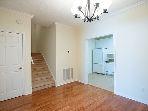 Welcome to the Meadowbrook Townhomes! This lightly lived-in home is apx 1,600 sqft with 3 bedrooms, 2 1/2 baths, and 1 huge double car garage located on the bottom level. The oversized garage offers tons of flex space for work, play, and storage! From the garage take the stairs to the main level, where you'll find the living area with front door access, dining room, and kitchen. The living space has beautiful, like-new, hardwood floors throughout with high ceilings and crown molding. The updated kitchen features granite countertops and a lovely tile backsplash. Located conveniently off the kitchen is the half bath and a cozy, covered back porch perfect for coffee and a good book. Head upstairs to the top level where you'll find all 3 bedrooms with freshly cleaned plush carpet throughout. The spacious main bedroom has a large walk-in closet, ensuit bath with double vanity sinks, and a flat screen tv already mounted for you as a bonus! All this home needs is you!