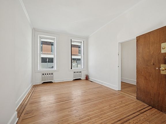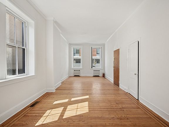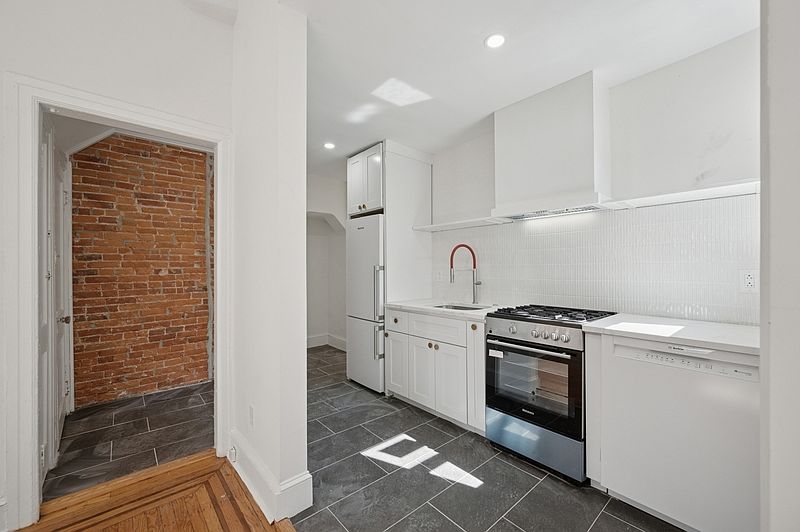 - Brownstone bones: high ceilings, hardwood floors, exposed brick wall, oversized wrap-around windows on three sides, filling the space with natural light