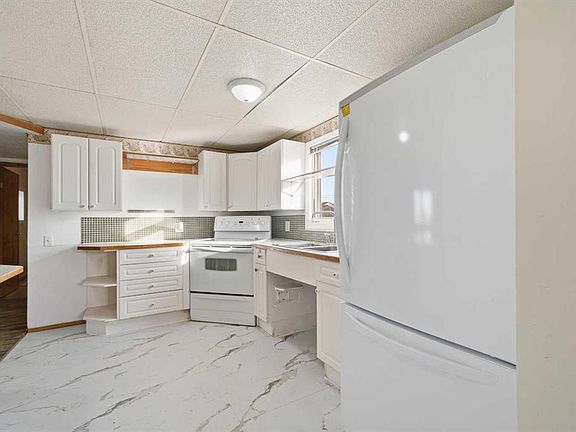 A 2 bedroom home on a large lot! Recent changes to the zoning makes this an ideal location for your small business (zoned C2). The front entryway greets you to the living room that features a vinyl window with view to the front yard. White melamine kitchen cabinets are complemented by full tile backsplash and an island. There are two bedrooms both with laminate flooring. The back entryway has a laundry area. The large yard has a wood deck and an oversized shed that could be used as a shop. Close proximity to amenities. New hot water tank just installed, also new fridge, flooring in kitchen, living room and hall, some fresh paint in bedrooms, living room & back entrance. 1" Styrofoam insulation installed under siding.