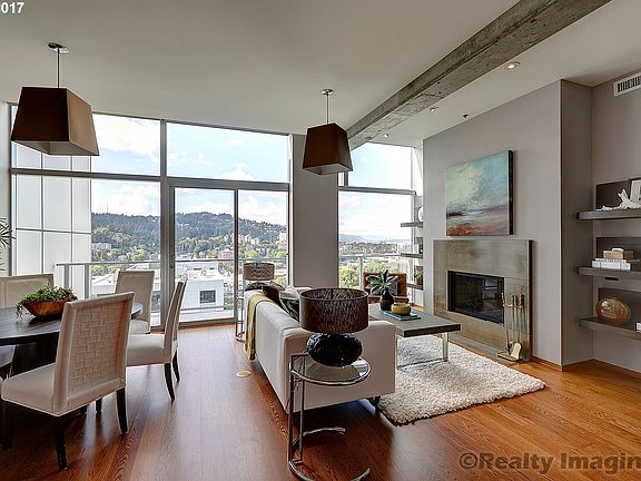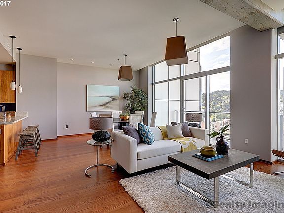 In the heart of the cultural district this top floor Penthouse has spectacular sunsets from spacious, light filled, great room. Kitchen boasts Thermador & Sub-Zero appliances. 2nd bedroom features floor to ceiling sliding glass doors making this versatile flex space w/attached built-in office. Expansive W/NW facing balcony provides ever-changing seasonal views of West Hills. Grocery & transportation at your door step.