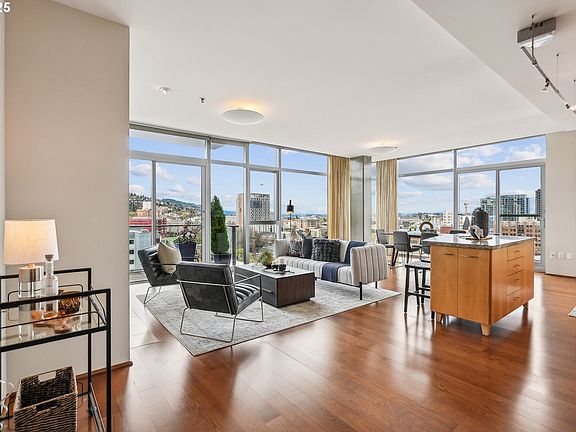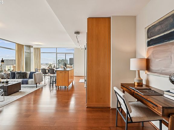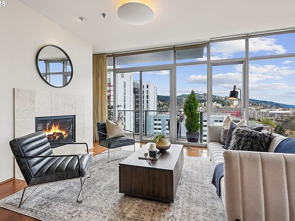 Northwest corner thoughtfully updated & perfectly designed with bedroom suites on opposites sides of the layout offering flexibility & privacy. The open great room has space for multiple sitting areas to take in the amazing views of the Vista Bridge, West Hills, beyond the St Johns Bridge, & over the city scenery. The view comes to you through the floor-to-ceiling glass framed by custom draperies & built-in mirrors reflecting the light beautifully throughout the space. Take in sunsets on the large 29-foot terrace outfitted with flowering potted plants attracting hummingbirds all year. Extra special features are the warm wood floors, gas fireplace wrapped in stone & modern lighting. The kitchen is upgraded with full height upper cabinets, a full height backsplash, SubZero refrigerator, & an island for prepping, serving, & entertaining. The primary suite has access to the terrace, wood floors, double closets, & a remodeled marble bath with a large walk-in shower surrounded by frameless glass. The guest suite also has added wood floors, connects to the 2nd bathroom & is perfect whether entertaining guests, working, or using as a media room. The oversized laundry room has extra built-in storage cabinets & includes the washer & dryer. A water leak detection system with sensors throughout provides an automatic shut-off for the condo for peace of mind. Also included are two deeded parking spaces. The building has many wonderful amenities: 24/7 concierge service, a fitness room & library on the 2nd floor, a meeting room, & a common terrace with kitchen & bath on the 3rd floor. Very well-managed building by the HOA & professional management. The Portland Art Museum, events at the Schnitz, Farmers Market, classes at PSU, downtown shopping, dining & iconic architecture are all right outside.
