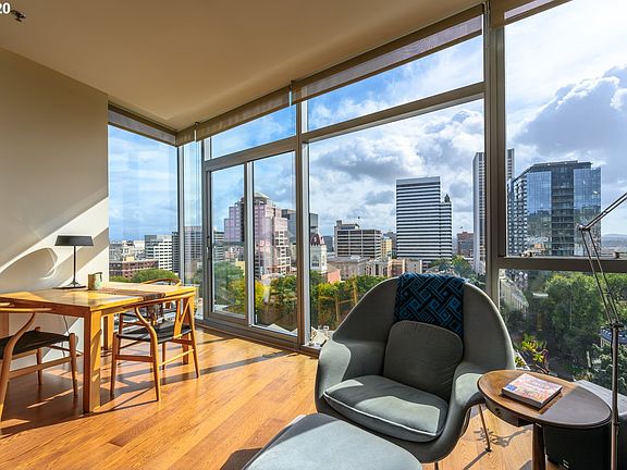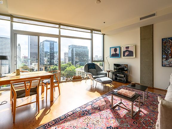 Stunning 180 degree views from this 12th-floor east-facing unit that put you in the heart of downtown. Very well-maintained with floor-to-ceiling windows, beautiful hardwood floors, upgraded appliances & utility systems, separate bedroom, and plenty of storage. Just steps to the Portland Art Museum, Arlene Schnitzer Concert Hall, Park Blocks and PSU. Deeded parking spot & additional oversized storage unit. HOA amenities include gym, library, common outdoor space, meeting room and 24hr concierge.