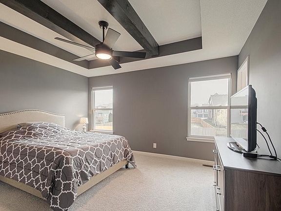 The master suite is a sanctuary of luxury, featuring a spacious layout, a walk-in closet, and a spa-like ensuite bathroom with dual sinks and fully tiled shower. The two additional bedrooms are generously sized, providing flexibility for a growing family, home office, or guest accommodations.