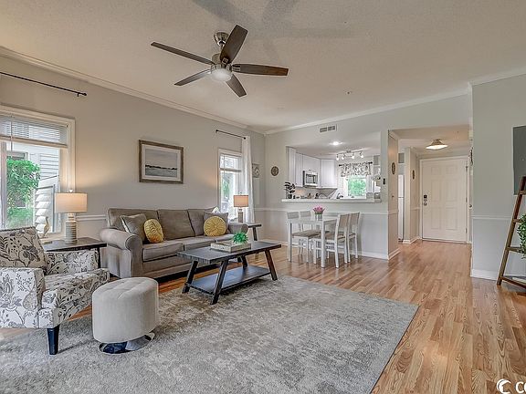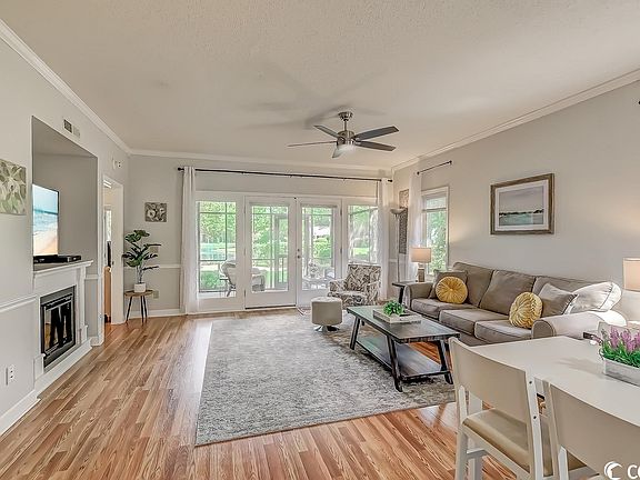 Discover coastal living at its finest with this charming 2-bedroom, 2-bath condo in Tidewater's Teal Lake Village. Freshly painted throughout, the main living area has a bright, open layout, and a cozy fireplace so you and your guests can enjoy the best of the beach year round. The spacious kitchen features granite tile countertops, stainless steel appliances, comes fully-stocked and stands ready to inspire your culinary creations. The roomy master bedroom is the perfect retreat, and boasts large windows, plenty of storage, and an ensuite bathroom with double bowl vanity. The clever furniture layout of the inviting second bedroom allows up to 5 guests to sleep comfortably. From the living room, open the French doors and step onto the screened-in patio with brand new ceiling fan and lockable storage closet. Relax with your morning coffee while you drink in the tranquil lake views and park-like setting. Perfect for full time living, second home, or investment property, this first floor, end unit comes fully furnished and is completely move-in ready. In addition to Teal Lake's pool, Tidewater community perks include two additional pools, fitness center, championship golf, clubhouse, restaurant + nearby dining and shopping. Don't miss this opportunity to own your dream coastal retreat!