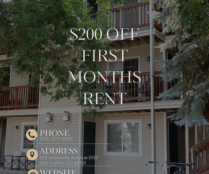Please join us at 1221 University Avenue A201 Fort Collins, CO 80521 on Wednesday August 20th from 1pm - 3pm! We have multiple units available all with back to school move in specials! Welcome to 1221 University Ave E103, a charming 2-bedroom, 2-bathroom condo ideally located just minutes from the Colorado State University campus. Blending comfort and convenience in a quiet community setting, this residence is well-suited for students, professionals, or anyone looking to enjoy the best of Fort Collins living. Inside, you'll find a light-filled living space anchored by a cozy fireplaceperfect for relaxing on cooler evenings or spending time with friends. Ceiling fans and central air throughout the home ensure consistent comfort year-round, while the traditional layout provides a warm, functional environment. The two bedrooms offer spacious retreats, with the primary bedroom featuring an en-suite bathroom and the second bedroom conveniently located near the shared hall bath. This setup provides flexibility and privacy for roommates, guests, or home office use. Water/sewer and trash are included in the rent, tenant is responsible for electric. Pets will not be accepted. Students are welcome; smoking is not permitted. Available now for $1,500/month. $60 application fee. All applicants 18 or older must submit their own application. Must make 2x the amount of rent. Proof on income, rental history and clean background required. APPLICANT HAS THE RIGHT TO PROVIDE A PORTABLE TENANT SCREENING REPORT PURSUANT TO CRS 38-12-902(2.5). IF APPLICANT PROVIDES A PORTABLE TENANT SCREENING REPORT, LANDLORD IS PROHIBITED FROM CHARGING APPLICANT A RENTAL APPLICATION FEE OR A FEE FOR LANDLORD TO ACCESS OR USE THE PORTABLE TENANT SCREENING REPORT.