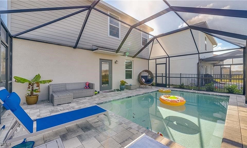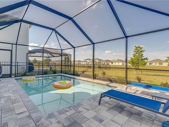 POOL HOME! Discover this gorgeous two-story, newly built (2023) pool home in the gated Savannah Lakes community. Boasting 5 bedrooms, 2.5 baths, and nearly 2,300 sq. ft., this home offers a spacious open floor plan, a screened lanai, and breathtaking lake views. The main level features tile flooring, a bright living and dining area, and a kitchen with granite countertops, stainless steel appliances, and a large pantry. Upstairs, you'll find a generous loft, five well-appointed bedrooms, and two full baths. The primary suite includes dual sinks and a walk-in shower, while the spare bath offers dual sinks and a tub/shower combo. Two of the bedrooms are currently used as home offices, perfect for remote work. Additional highlights include a paver driveway, a screened-in paver lanai. Enjoy the luxury of a private pool with stunning water views, all within a secure, gated community. Don't miss this incredible opportunity schedule your showing today!
