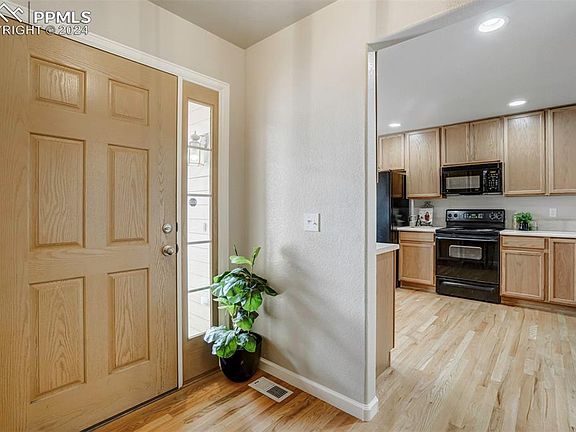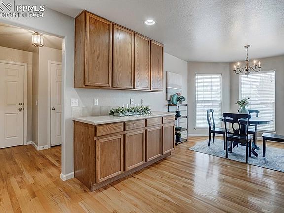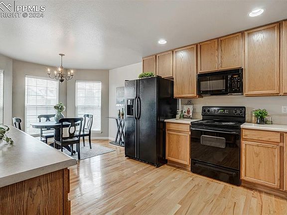 Welcome to this beautiful main-level living 6-BEDROOM home in the desirable Woodmen Hills subdivision! This charming property showcases a NEW Class-4 roof, NEWLY fresh interior paint, and NEW carpet throughout. Step inside to discover an inviting open floor plan with vaulted ceilings, perfect for entertaining and everyday living. The spacious living room features a cozy gas fireplace and walks out to a composite deck, ideal for enjoying the outdoors. The home is equipped with A/C and ceiling fans, ensuring comfort year-round. The eat-in kitchen is accented with natural wood floors, a pantry, and ample cabinet space. You'll appreciate the oversized 2-car garage with a NEW garage door, providing plenty of room for vehicles and storage. Enjoy the covered front porch area, adding to the home's curb appeal. Don't miss the opportunity to own this welcoming home!!