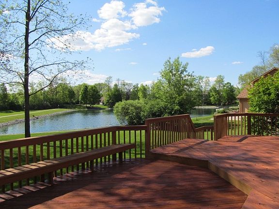 **Accepted Offer; Taking Backup Offers** Relax on your deck and watch the sunset across the pond. This gracious well built 4 bedroom home is ready for a new owner. The main floor offers a dining room, living room, family room with brick fireplace, open kitchen, den and laundry room. The master suite has a huge closet and sitting room. The master bath views are fabulous! The basement with wet bar full bath and fireplace is a great entertaining space. The home has 6 panel wood doors, beams, built in shelving for displays, a den with separate entrance, oversized 2 1/2 car garage, foyer, abundant storage, walk-in closets and so much more. Walking trails in the neighborhood adjoin bike trail.