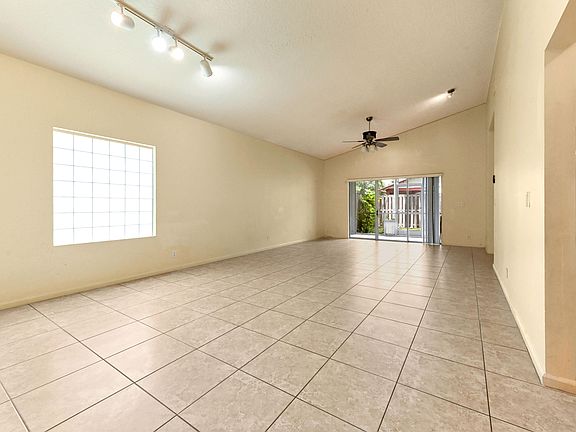 Welcome to this charming single-story home, perfectly situated in the desirable Wellington Downs community. This inviting residence features 3 bedrooms and 2 full bathrooms, offering a seamless blend of modern updates and classic comfort. As you step through the front door, a welcoming foyer leads to a beautifully updated kitchen on your left, complete with gleaming granite countertops, pristine white cabinets, and a cozy breakfast area--ideal for your morning coffee. The main living and dining areas combine to create an expansive, open space, enhanced by soaring vaulted ceilings that create a bright and airy atmosphere. The home's functional layout is complemented by elegant tiled flooring that extends throughout, offering both durability and a cohesive aesthetic. The bedrooms all feature ample closet space, providing plenty of storage. The master bedroom is a private sanctuary, boasting a walk-in closet and an ensuite bathroom. For ultimate convenience and a touch of luxury, the master bedroom also provides direct sliding door access to the back patio. A dedicated laundry room adds to the home's practical appeal, making daily chores effortless. Step outside to discover your private oasis: a screened patio that is perfect for year-round enjoyment, overlooking a fenced backyard that provides a secure space for play or relaxation. Enjoy the peace of mind that comes with a home that has been lovingly maintained, featuring an updated kitchen and bathrooms, as well as a newer A/C unit installed in 2019. The HOA takes care of yard maintenance, freeing up your time to enjoy the community's resort-style amenities, including a pool and tennis court. With a prime Wellington location, this home is within walking distance of the community center, shopping, and dining, and just minutes from all the area has to offer.