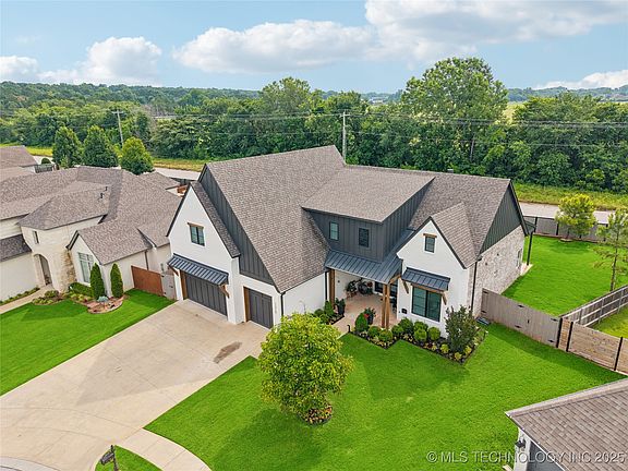 Beautiful custom home in Bixby North Elementary district! This one of a kind builder's home is a MUST SEE. Larger lot than most in the neighborhood, with no neighbors behind you, you can enjoy the expansive outdoor space with your family. You will LOVE this convenient neighborhood, with the home located 1 block from the pool. A few of the upgrades include: HUGE covered/vaulted back patio with a gas/woodburning built in fireplace, gorgeous wood plank patio ceiling, room for a hot tub or 2nd sitting area, plenty of lighting, and a large celing fan. The structure includes 2x6 exterior wall framing for better insulation, a three zone HVAC, 10 ft. high ceilings downstairs, hardwood floors throughout the main areas, majestic cathederal vaulted living room with linear gas fireplace, vaulted primary suite, vaulted study, and vaulted entry. You will also have 8 ft. doors on 1st floor, decorative beams and floating shelves with custom cabinetry throughout to make this space cozy and inviting. In the chef's kitchen you'll find upgraded granite & quartz counter tops, a massive center island with 6cm mitred edge quartz, pro appliances with double fridge/freezer unit, double oven, & spacious walk-in pantry. The primary suite is a dream with ample room for everything. The primary bath has an enormous double walk-in shower with zero entry, freestanding soaker tub, and oversized separate vanities. A substantial laundry room, complete with sink and a full pantry cabinet, connects to primary closet and primary bath suite. Upstairs you will find 2 bedrooms, 2 full bathrooms with extra deep soaking tubs, a large vaulted game room, second laundry room, and 3 large walk out attic storage spaces. The extra deep/extra wide garage has 8' tall overhead doors for your large trucks & vehicles, as well as an in floor storm shelter. Bonus... Brand New Exterior Paint, May 2025 with new paint in the kitchen and primary bath December 2024. Owner is a licensed real estate agent.