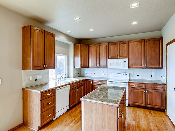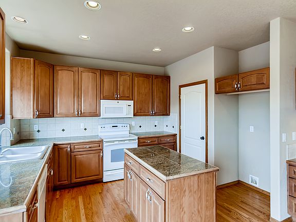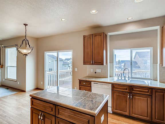 The beautiful curb appeal of this recently updated 5 bedroom, 3.5 bathroom home in Meridian Ranch invites you inside! As you enter the home you will notice gorgeous hardwood floors and an open flow between rooms. The spacious kitchen includes granite countertops, plenty of cabinet space, a pantry closet, and a built-in desk perfect for a homework station! The comfortable primary bedroom features a walk-in closet and an expansive en suite bathroom with a dual sink vanity and a separate, oversized bathtub. The finished walk-out basement is outfitted with a wet bar, great for guests and football Sundays! There is also a 3 car garage which provides plenty of space for cars as well as room for an at-home workshop! Located close to Antler Creek Golf Course, Falcon Regional Dog Park, and close to Highway 24 for quick commuting!