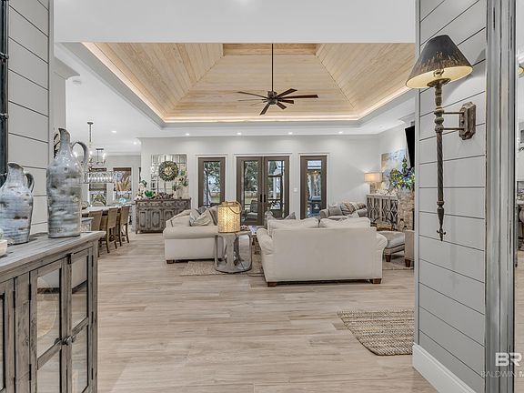 Welcome to 12216 Mandrell Lane, Fairhope, AL—a Gold Fortified masterpiece by Drexel Boothe, set on nearly 2 acres framed by majestic Live Oak trees. This 4-bedroom, 4-bath, 3,676 SF estate blends luxury, comfort, and modern design, making it one of the area's most sought-after homes. Inside, the open-concept layout features vaulted tongue-and-groove ceilings, a stacked-stone fireplace, and a bar with a wine cooler—perfect for relaxing or entertaining. The chef’s kitchen boasts premium KitchenAid appliances, a built-in fridge, six-burner gas range with pot filler, ice maker, trash compactor, and a walk-in pantry with floor-to-ceiling shelving. A standout feature is the 900 SF multi-purpose “Cabela” room, a state-of-the-art retreat with a laser projector system, 100” wall-mounted monitor, Orion inset fireplace, and a beverage bar with custom cabinetry. Reclaimed barnwood and stone accents complete the space, ideal for a home theater, executive office, or game room. The primary suite offers a vaulted ceiling, spa-inspired ensuite, and custom walk-in closet. The split-bedroom layout ensures a spacious feel, with 11’ ceilings and 8’ doors throughout. Outdoor living is just as impressive, with a screened porch, covered patio and grill area, and a fenced backyard designed for relaxation and entertaining. The 1,000 SF detached garage features epoxy flooring, plumbing, and electrical, offering options for a workshop or guest house. Additional features include generator-ready wiring, impact windows, a seamless metal roof, an irrigation well with sprinklers for the Zoysia lawn, and a security system with six cameras. Located just 15 minutes from Thomas Hospital or Baldwin Health Center, this home offers both tranquility and convenience. $10,000 buyer concession available! Schedule your private showing today—this exclusive property won’t last long! Buyer to verify all information during due diligence.