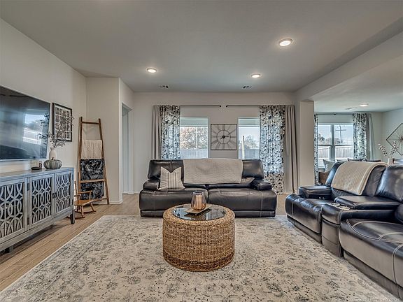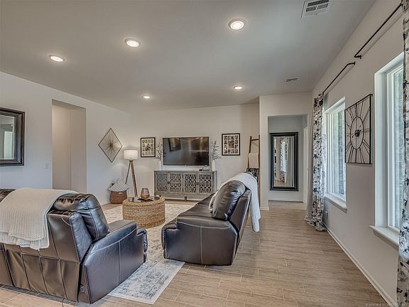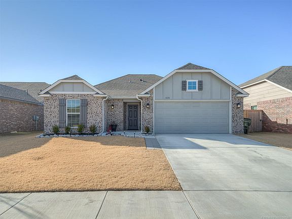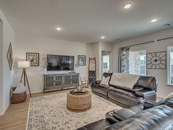 MOVE IN READY barely lived in, new in Morrow Place! Beautifully finished w/ full privacy fence, wood-look tile floors throughout living areas & bthrms, & plush carpet in bdrms. Transitional farmhouse touches w/ upgraded white Blanco single basin kitchen sink, automatic light in pantry, touch faucet, Quartz countertops in the kitchen, Whirlpool appliances including gas range, & nice closet storage. Neighborhood pool & playground. Owasso's brand-new & highly rated Morrow Elementary is in the neighborhood!