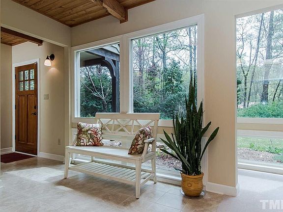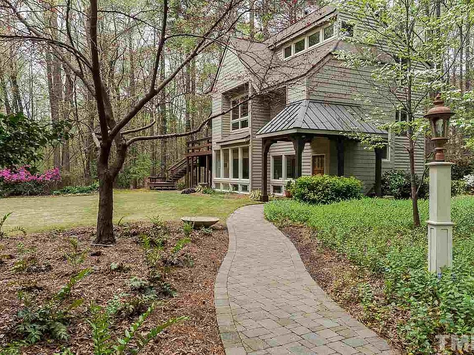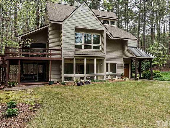You'll LOVE the fresh air and serenity of this one-of-a-kind home, secluded among trees. Designed by artisans to blend the airy openness of a contemporary with the sunny warmth of a transitional! Lovely architectural touches-soaring wood ceiling, exposed beams, stacked stone+huge windows. Kitchen floor/vintage brick. Pine plank floors/main Living Area & Master. Granite & S/S in kitchen. Granite+tile in updated Master Bath. Many built-ins. Landscaped Zoysia lawn. 2 screen porches! Convenient to RDU, I-540.