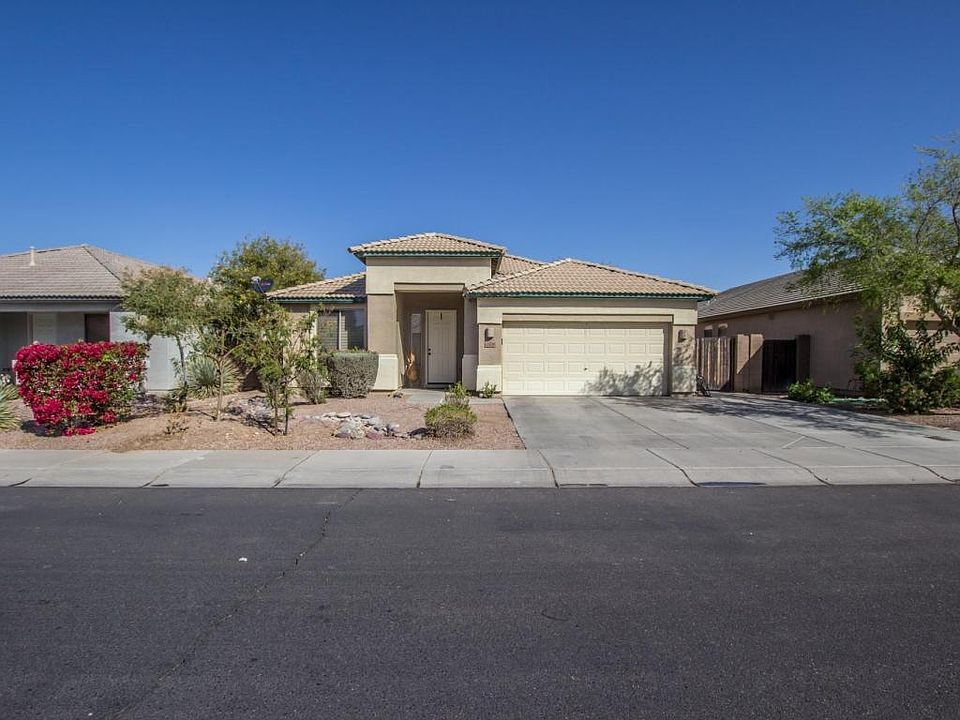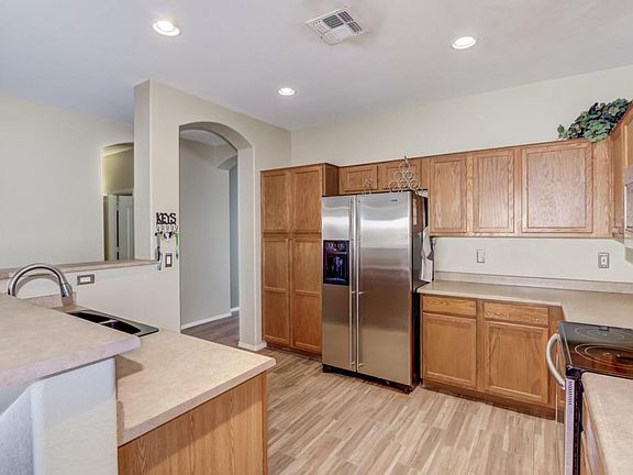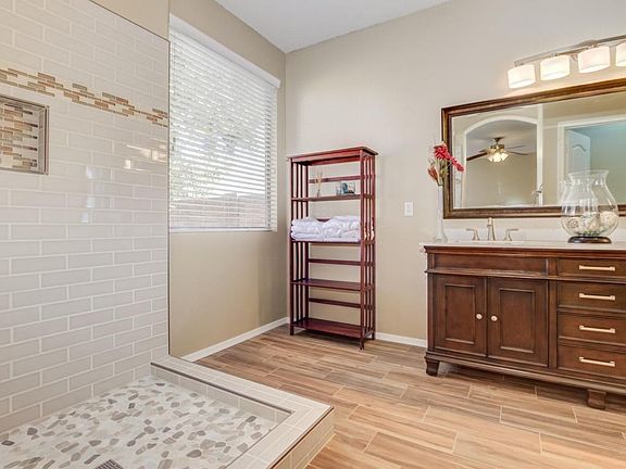 MOST POPULAR FLOORPLAN with an extended driveway giving you parking for 3 vehicles! You notice the difference instantly walking in on the new wood looking plank tile thru out. Kitchen highlights include newer stainless steel microwave, smooth top electric stove, dishwasher, plus a new kitchen sink in the center island. Formal dining/living room in front entry, great room style family room, and kitchen in back. Master bedroom includes brand new carpet, ceiling fan, but the bathroom is gorgeous with a custom built tile enclosed shower, new cabinets, sinks and fixtures...plus large walk in closet. Backyard is just as beautiful with a covered patio, extra paver walkway and extended patio, cozy planters and seating, grass and even a dog run.