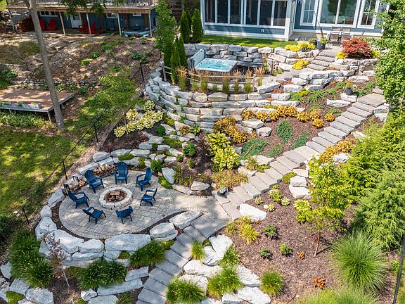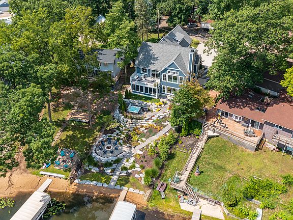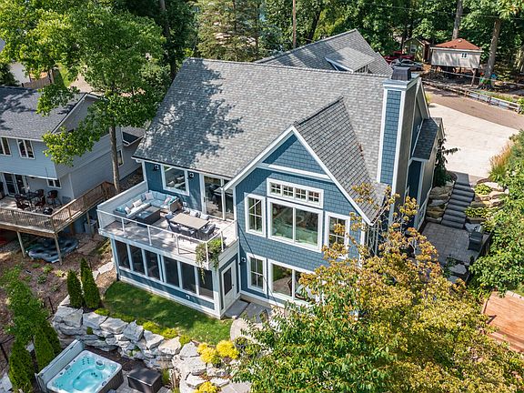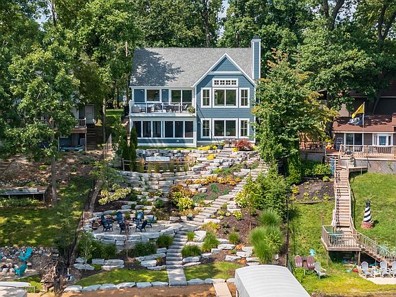 Stunning 2 year old resort style waterfront home located on Lake 4 of all sports Pine Lake! Pine Lake is a friendly lake community with 4 interconnected lakes totaling over 660 acres making this an amazing place to live! This custom built home was built as a dream home with all the bells and whistles, high end materials and quality in mind! Incredible custom designed tiered landscaping with 3 levels of natural limestone retaining walls, gorgeous walkways, built in firepit area and hot tub area! The side has a fenced in dog area with puppy pickets for small dogs. You will also find a large lawn with decorative fencing. The entrance features a barrel ceiling and gorgeous white oak wood floors! Your breath will be taken away with the living room, large windows with views of the lake and an incredible vaulted ceiling with custom woodwork! The stone fireplace has a built in area for the tv and built in bench seats that have storage underneath! The gorgeous designer kitchen is open to the living room with incredible views of the lake. The appliances are high end GE Cafe series stainless steel featuring a double oven! The kitchen features a custom made large island with shelves on each side and seating, quartz countertops, subway tile backsplash, white oak shelves and a large pantry! The deck off the kitchen features Ipe wood and breathtaking views of the lake! There is an office on the main floor with built in cabinets. The main floor primary suite features a large walk in closet, plantation shutters, and a gorgeous primary bath! This space has beautiful octagon tile floor, dual sinks, separate toilet area and a beautiful walk in tile shower with glass doors! The separate laundry room features slate flooring and built in cabinets with a bench seat, shelves and plenty of cabinets! A beautiful 1/2 bath with a pedastal sink and Serena and Lily wallpaper! An amazing loft above the garage is something to see. This space features 4 built in bunk beds each with their own light and shelf with a plug for charging a phone, a living room space, a bar with cabinets and wine fridge and a full bath! The lower level features a beautiful family room with a stone fireplace, built in shelves, wet bar with subway tile and gorgeous custom made wood shelves! There is a bonus room with built in bookcase/shelves that could be used for an extra office, exercise room or craft room! The beautiful 1/2 bath has wainscoting and octagon tile flooring. The guest section features 3 beautiful bedrooms with walk in closets and a full bath! The screened in porch is gorgeous and is so peaceful to sit in! Additional features include a whole house generator, hardy board siding, an iron filtration system, underground sprinklers including a drip system throughout all landscaping, and the home is wired for a security system. One of the favorite features of this home to the owners is being located in the cove. The serenity and peace is something to note! Also a favorite swimming spot on the lake too! This is an amazing opportunity for someone to purchase this dream home and move right in and start enjoying lake living!