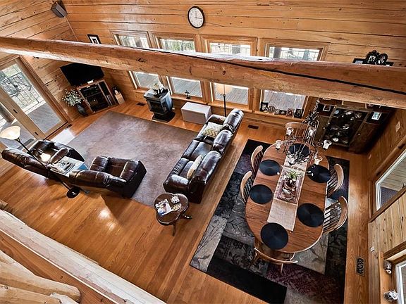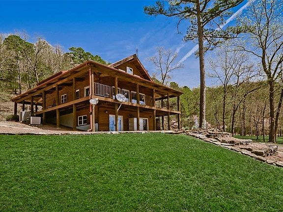 Cozy Log Cabin with over a half mile of lakefront with 4 slip dock on 75 Acres. Unrestricted property offers development potential. Home has easy access to the lake with wonderful views. 3 bedroom 3 bath, 2464 sq. ft. with great lake views from the wrap around porches. Vaulted ceiling in the great room with open floor plan make this a perfect lake home. Property has large shed, RV parking with water/sewer/electric hookups. 3825 Watt Solar System, wood burning stove on lower level and propane stove in great room. Beautiful setting with limestone bluffs and gated entry. Easy drive down access to the boat dock.