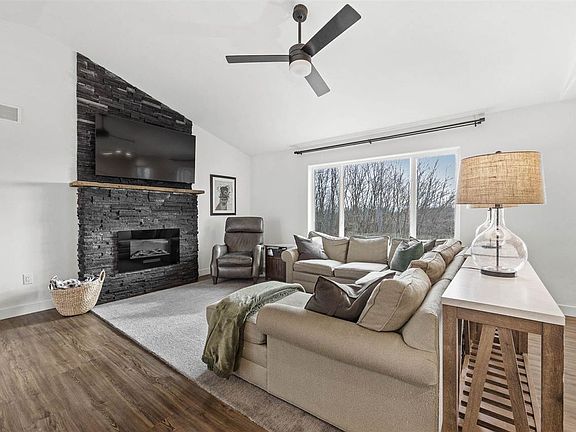 Discover this stunning 6-bedroom, 3-bathroom ranch walkout home, offering nearly 2,500 sqft of beautifully designed living space on over half an acre. Luxury vinyl plank flooring flows seamlessly through the kitchen, dining, and living room, where a sleek flat-panel electric fireplace adds warmth and style. The open-concept kitchen features white painted cabinets, quartz countertops, stainless steel appliances, and a convenient water filtration system, with matching quartz countertops in the bathrooms and laundry room. The master suite boasts a large tiled shower with a glass surround for a spa-like retreat. Additional upgrades include a brand-new garbage disposal, a smart garage door opener, an EcoBee thermostat for energy efficiency, and a Google Nest doorbell camera for added security. Outdoor living is just as impressive, with a 12' x 12' screened porch and a walkout lower-level patio, perfect for entertaining. Completing this exceptional home is a spacious 3-car garage, offering ample storage and convenience. Don't miss this incredible opportunity to own a beautifully upgraded home in a fantastic setting!