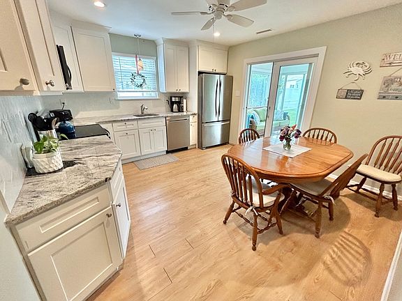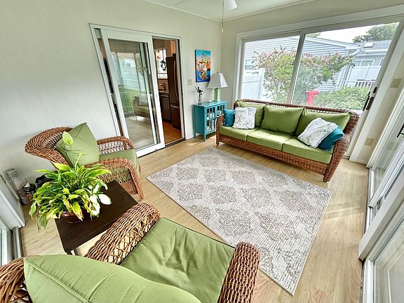 Call for showing availability. An expanded and updated 3-bedroom twin with a Florida room lined with 4 glass sliders overlooking a private professionally manicured back yard. This Village Greene twin has been modernized, featuring a beautiful new kitchen with granite counters and custom tile backsplash, recessed lighting, and stainless-steel Whirlpool appliances. Walk into a bright and airy living room and enjoy 3 bedrooms, a refaced full bathroom, and a powder/laundry room. To the rear of the home is the open new 2019 kitchen leading to the Florida room. Amenities include laminate wood style flooring throughout, new ceiling fans, and a freshly painted interior, The exterior of the home includes a covered front porch for rocking chairs, a new expansive paver patio, mature trees, and a remaining garage area that can fit bikes and beach chairs.
