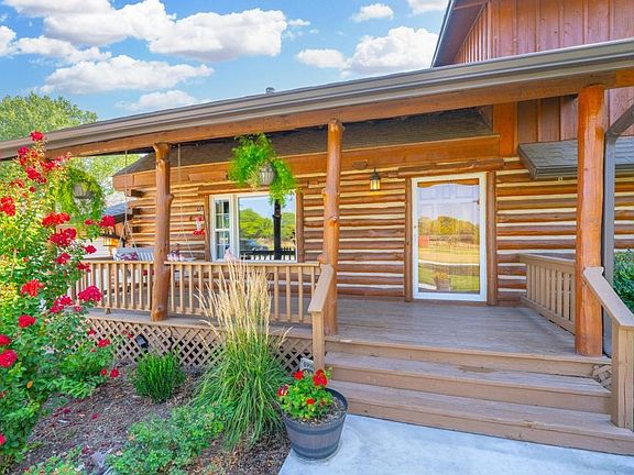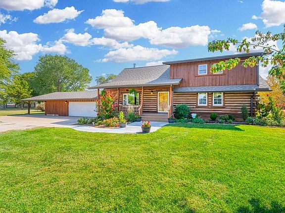 Log Home on 40 ACRES set up for horses/cattle! Charming! Rustic! One owner! Just 1/4 mile off Blacktop, Just 30 minutes South of Wichita, Kansas! Beautiful lined treed driveway is the entrance to your future country living! Exterior features: 36x36 Barn with concrete floors, 50 amp electric service, water, and 12 ft lean to plus 48' x 12' Livestock sun shelter, 2 freestanding 24'x12' livestock sheds, freezeless automatic water in pasture, (2) 5 acre brome fields, 25 acre bermuda pasture with perimeter fencing, 5 livestock handling pens with continuous pipe fence and attached squeeze chute, 60 ft round pen, irrrigation well. Buried electric dog fence approx 4 acres, Sprinkler/irrigation system around house, City Water plus irrigation well, Mature trees as well as newly planted trees. Attached 2 car garage with attached covered carport with storm cellar. Roof replaced in 2020 with Class 4 impact resistant shingle. House Features: Enter this home from the covered front porch into the vaulted wood beam living area with solid fir wood floors! Rustic 4 Bedroom, 3 bath, 2 living rooms Log home at its best! Master bedroom is just up the stairs in closed loft area with plenty of room. Master bathroom and walk in closet. Complete kitchen renovation in 2018: Granite countertops, Stone backsplash, solid Alder Wood Cabinets with soft closures, Reverse osmosis system. Large addition added a formal dining room, large vaulted beamed main floor second living room, 4th bedroom and 3rd bathroom. Additional main floor bedrooms are roomy in size and located by main floor bathroom. 34' x 8' Utility room is off the garage in a separate room: (2) geothermal heat pump systems new in 2014, House water softener. Last but not least is the beautiful deck off the back of the home to enjoy your time in the country. This is a rare find!
