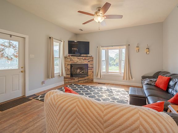 This charming ranch-style home offers a perfect blend of modern updates and cozy charm, making it simply adorable. Situated on a spacious half-acre lot, the property welcomes you with a covered front porch, setting the stage for a warm and inviting atmosphere. Step inside to discover an open concept layout with impressive 10+ foot ceilings, creating a sense of spaciousness and airiness. The living room boasts original hardwood floors and a delightful corner fireplace. The well-appointed eat-in kitchen, featuring white cabinets, granite countertops, and stainless steel appliances, including a gas range. The primary bedroom boasts the attached full bath with new granite vanity and dual sinks. Outside, a covered patio and koi pond. The detached garage is a standout featuring a workbench, and a lean-to for additional storage, catering to hobbyists and DIY enthusiasts alike. Additional parking on the west side of the home adds further practicality and convenience.