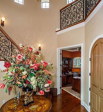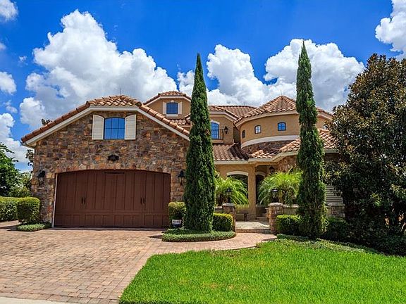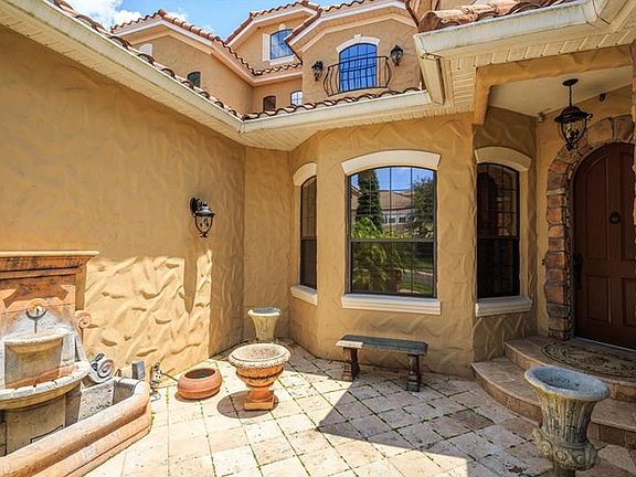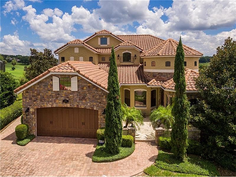 TUSCAN TREASURE! The front door, flanked by potted plants & a tranquil water feature leads you to the main level. Beautiful hardwood floors welcome you into the formal dining room with intricate crown moulding and the den complete with custom plantation shutters or up the grand staircase to the owners retreat. The open floorplan leads you into a large family room. Floor-to-ceiling windows overlook the relaxing patio, golf course & pond, a stone, gas fireplace, soaring ceilings, built-in surround-sound and massive crown moulding! The gourmet kitchen boasts furniture-grade cabinets, granite countertops, under mount double sink, 48" Wolf gas range & hood with travertine surround, integrated panel refrigerator & wine cooler. Adjacent utility room walks through to a generous 2 car plus golf cart garage. The 3rd bedroom shares a bathroom with an adjacent en-suite guest bedroom. Circular stairs lead up to the owner's retreat bursting with natural light, dual walk-in closets with shoe organizers & built-ins. The master bath is complete with dual gentleman-height furniture-grade vanities, jetted tub & walk-in Rain shower with bench. A multi-purpose "L" shaped sitting room is situated at the far end of the sleeping area. Step out to the large balcony, which overlooks the 17th green of Errol's "Highlands" golf course. Lower level is capped off with a wine cellar, covered outdoor patio with summer kitchen & another full bath, then a short elevator ride back up to the rest of the house! This home is Special!