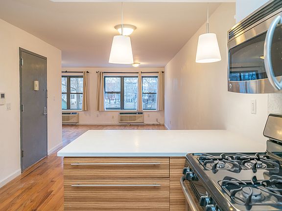 Tree-lined 1222 Halsey Street overviews beautiful Irving Park in Bushwick, Brooklyn. The spacious 888 sqft floor-through 2BR 1BA apartment has hard wood floors, an island kitchen, breakfast bar seating, closeted bedrooms, coat closet, and through wall heat/ac units. The large L-shaped living room offers plenty of space for dining , living room and desk areas. Facing northern and southern exposures, the apartment has bright natural light. Close to L and J trains, the apartment offers speedy access to Manhattan, Queens and Williamsburg destinations. Bedrooms can fit queen size beds. Pets are allowed. Located in trendy Bushwick, tenants will have access to many local bars, restaurants and coffee shops. One or two year leases offered.